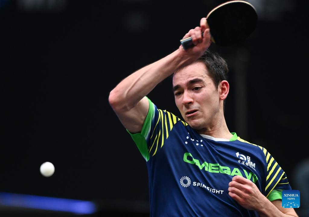 Hugo Calderano of Brazil hits a return during the men's singles round of 32 match between Hugo Calderano of Brazil and Benedikt Duda of Germany at the WTT Star Contender Doha 2022 in Doha, Qatar, March 28, 2022. (Photo by Nikku/Xinhua)