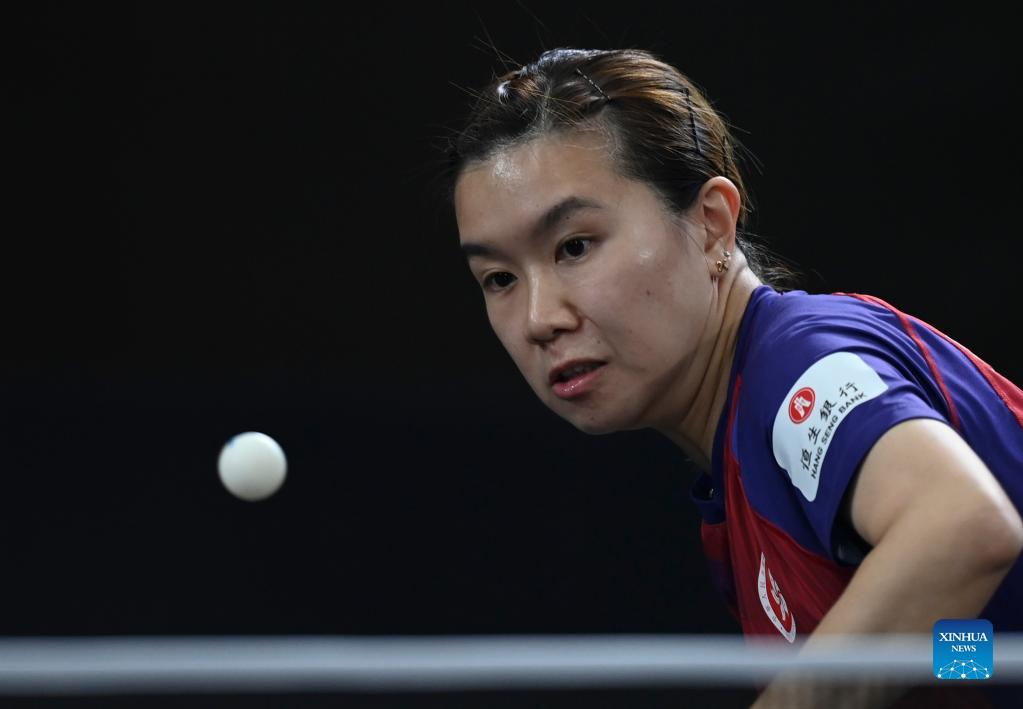 Lee Ho-Ching of China's Hong Kong hits a return during the women's singles round of 32 match between Lee Ho-Ching of China's Hong Kong and Suthasini Sawettabut of Thailand at the WTT Star Contender Doha 2022 in Doha, Qatar, March 28, 2022. (Photo by Nikku/Xinhua)