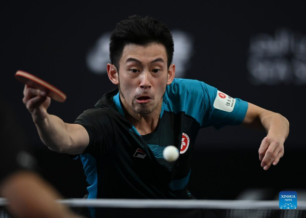 Wong Chun-Ting of China's Hong Kong hits a return during the men's singles round of 32 match between Wong Chun-Ting of China's Hong Kong and Wang Yang of Slovakia at the WTT Star Contender Doha 2022 in Doha, Qatar, March 28, 2022. (Photo by Nikku/Xinhua)