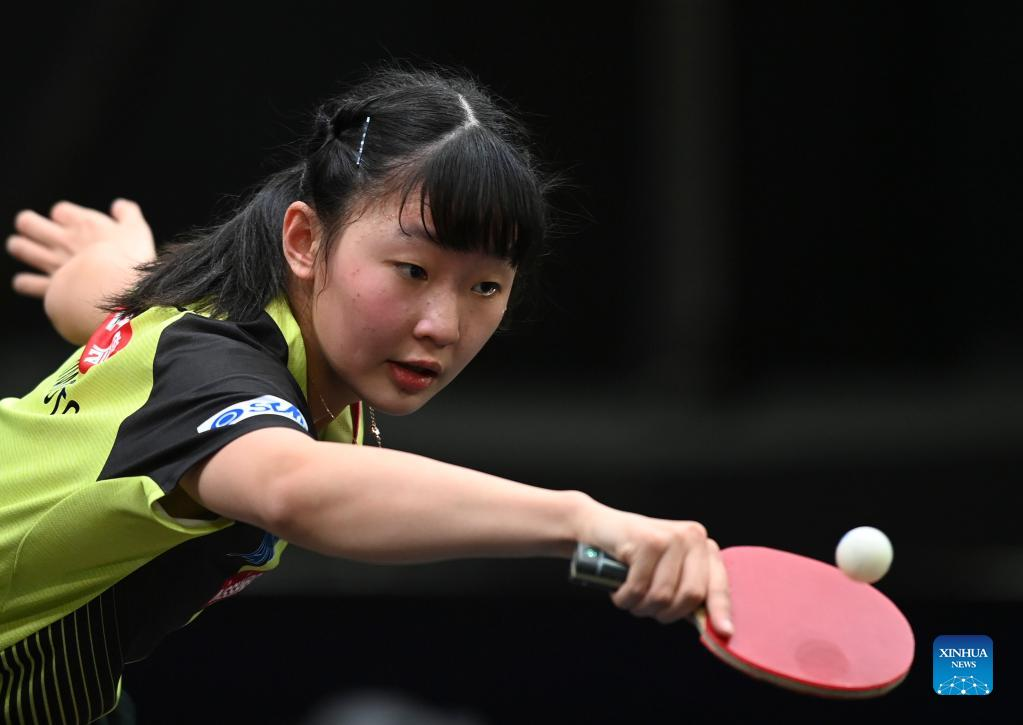 Harimoto Miwa of Japan hits a return during the women's singles round of 32 match between Han Ying of Germany and Harimoto Miwa of Japan at the WTT Star Contender Doha 2022 in Doha, Qatar, March 28, 2022. (Photo by Nikku/Xinhua)
