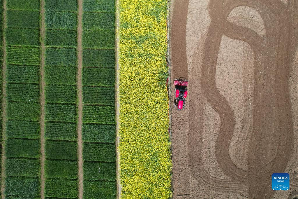 Aerial photo taken on March 28, 2022 shows farmers working in the fields in Xinghuliu Village, Jiazhai Township of Liaocheng City, east China's Shandong Province. (Photo by Zhao Yuguo/Xinhua)
