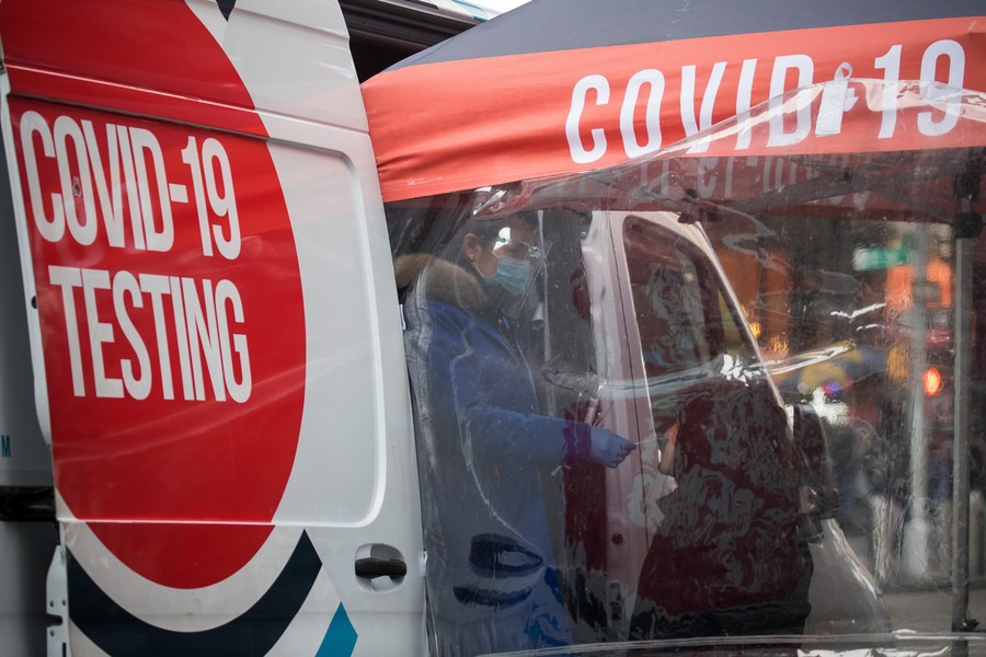 A man receives a COVID-19 test on Times Square in New York, the United States, March 28, 2022. (Photo by Michael Nagle/Xinhua)