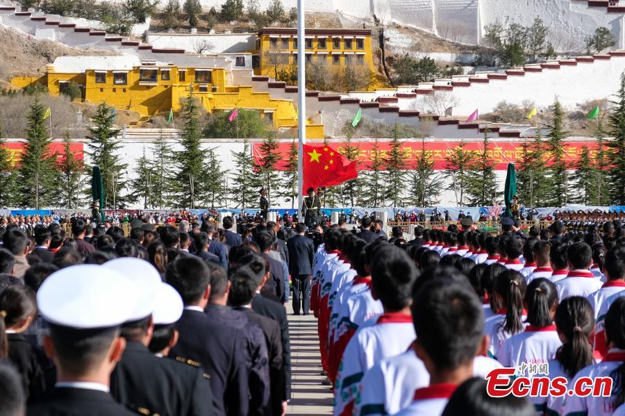 People attend a ceremony to celebrate the Serfs' Emancipation Day at the square in front of the Potala Palace in Lhasa, capital of southwest China's Tibet Autonomous Region, March 28, 2022. (Photo: China News Service/Jiang Feibo)