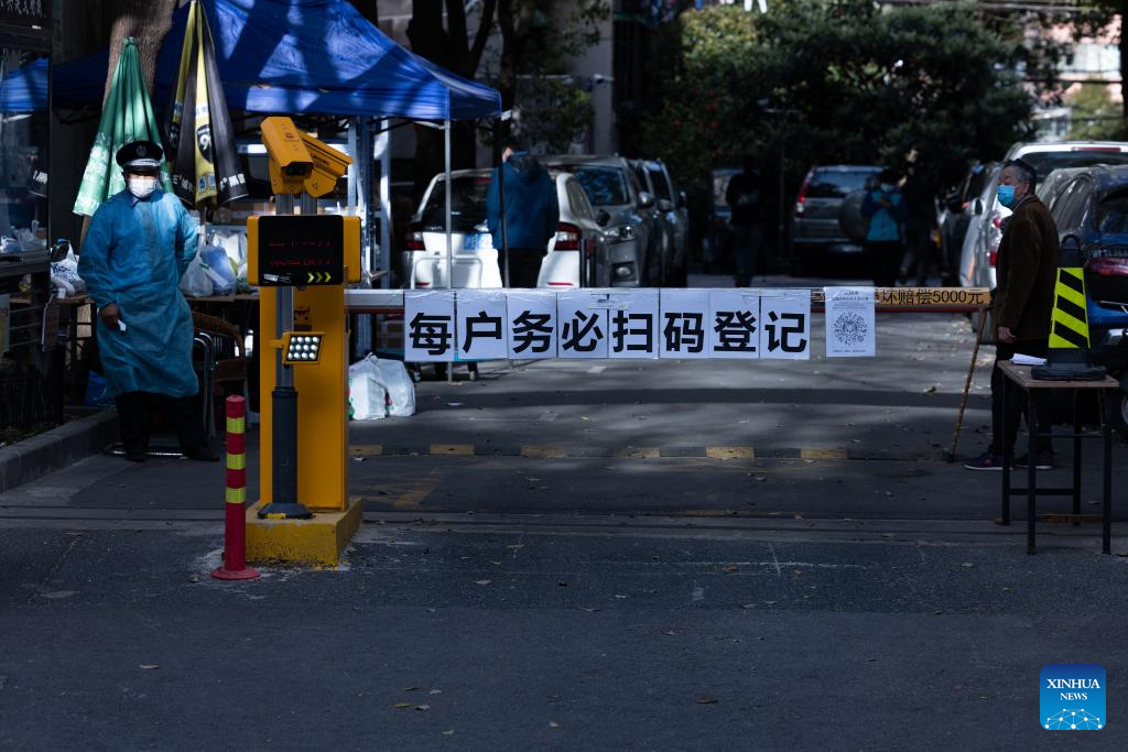 Staff work at a community entrance in Xuhui District, east China's Shanghai, March 29, 2022. China's economic hub Shanghai, with a population of over 24 million, has been split into two parts to enforce temporary closed-off management between March 28 and April 5 to hunt down possible infections and curb the spread of the virus. (Xinhua/Jin Liwang)