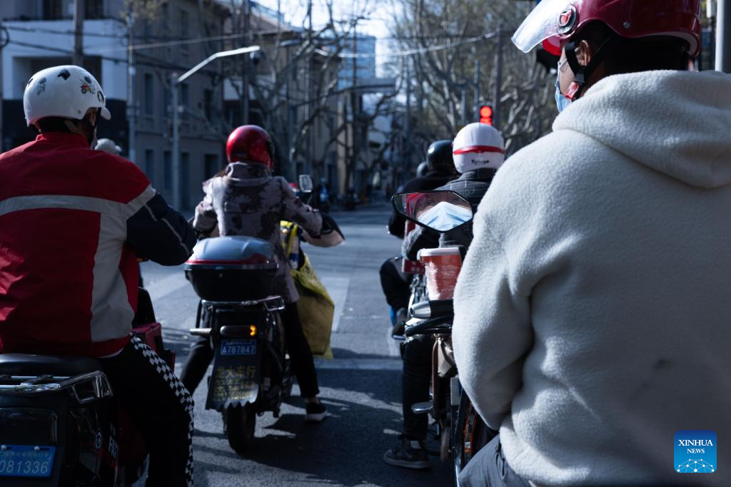 People wait for traffic lights at a crossroad in Xuhui District, east China's Shanghai, March 29, 2022. China's economic hub Shanghai, with a population of over 24 million, has been split into two parts to enforce temporary closed-off management between March 28 and April 5 to hunt down possible infections and curb the spread of the virus. (Xinhua/Jin Liwang)