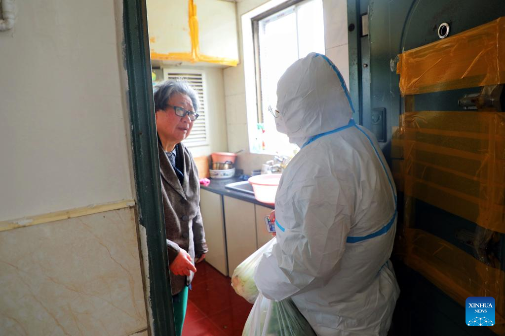 A community worker delivers vegetables for an elder resident at an area under temporary closed-off management in Fengxian District of east China's Shanghai, March 29, 2022. China's economic hub Shanghai, with a population of over 24 million, has been split into two parts to enforce temporary closed-off management between March 28 and April 5 to hunt down possible infections and curb the spread of the virus. (Xinhua)