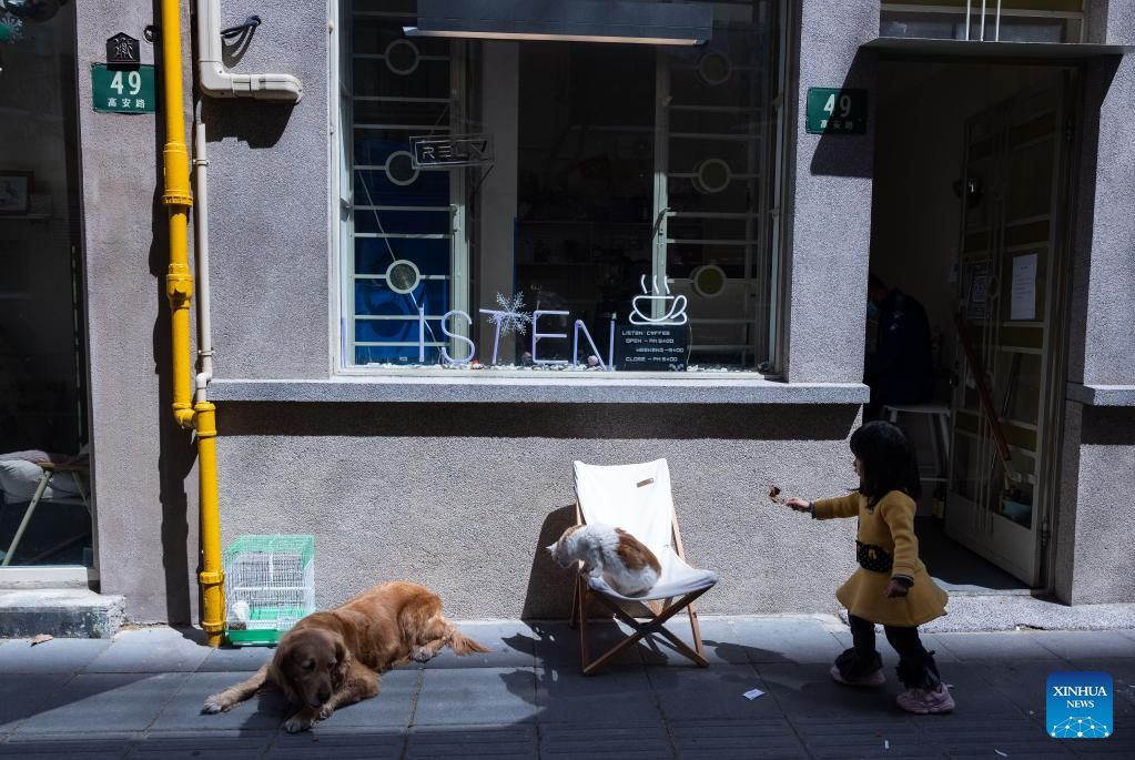 A girl walks outside a cafe in Xuhui District, east China's Shanghai, March 29, 2022. China's economic hub Shanghai, with a population of over 24 million, has been split into two parts to enforce temporary closed-off management between March 28 and April 5 to hunt down possible infections and curb the spread of the virus. (Xinhua/Jin Liwang)
