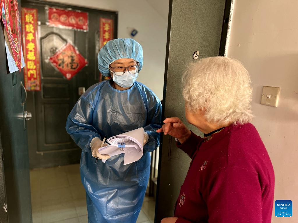 A community worker writes down the needs of an elder resident at an area under temporary closed-off management in Fengxian District of east China's Shanghai, March 29, 2022. China's economic hub Shanghai, with a population of over 24 million, has been split into two parts to enforce temporary closed-off management between March 28 and April 5 to hunt down possible infections and curb the spread of the virus. (Xinhua)