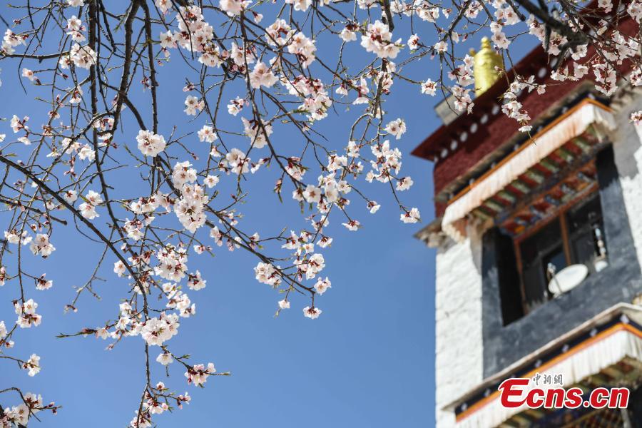 Picturesque scenery of peach blossoms beside the Phabongkha Monastery in northern suburbs of Lhasa, capital of southwest China's Tibet Autonomous Region, March 28, 2022. (Photo/China News Service)