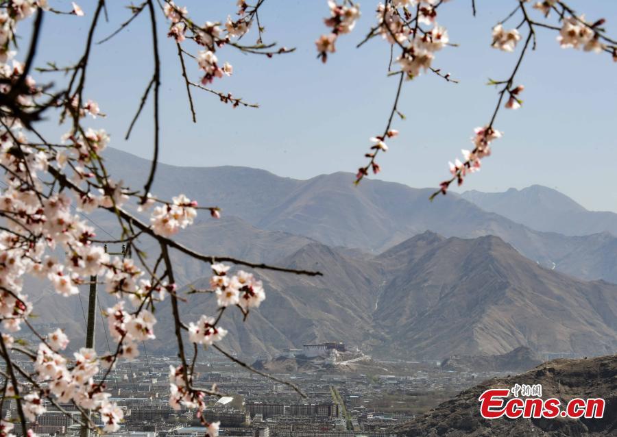 Photo shows the scenery of the Potala Palace seen far away from the Phabongkha Monastery in northern suburbs of Lhasa, capital of southwest China's Tibet Autonomous Region, March 28, 2022. Peach blossoms are seen beside the Phabongkha Monastery. (Photo/China News Service)