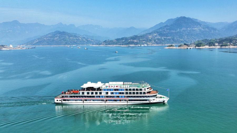 Photo shows Yangtze River Three Gorges 1, the world's largest electric cruise ship, made its maiden voyage in Yichang, central China's Hubei Province, March 29, 2022. (Photo: China News Service/Zhou Xingliang)