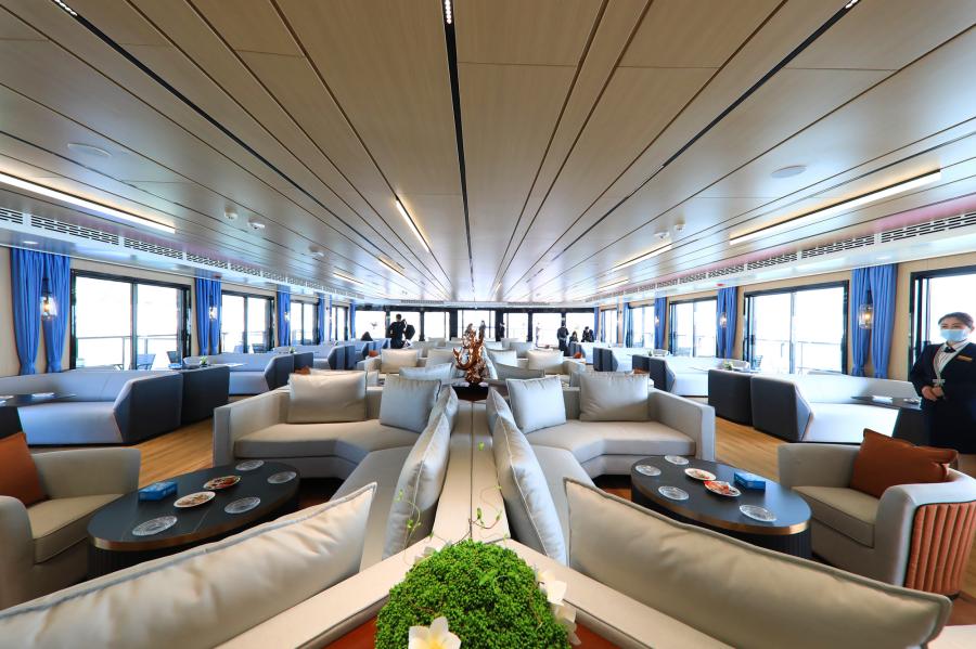 Photo shows the interior of the Yangtze River Three Gorges 1, the world's largest electric cruise ship in Yichang, central China's Hubei Province, March 29, 2022. (Photo: China News Service/Guo Xiaoying)