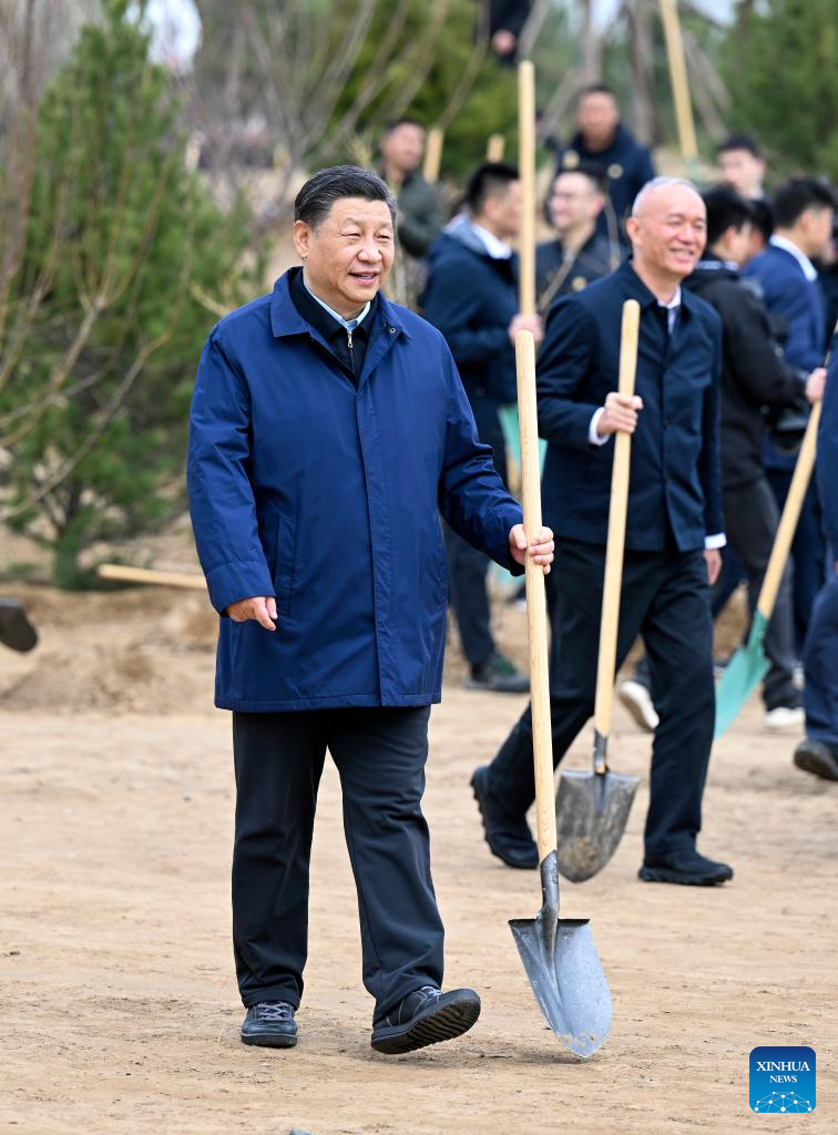 BEIJING, March 30 (Xinhua) -- Participating in Beijing's tree planting activity on March 30, Xi Jinping, General Secretary of the Communist Party of China (CPC) Central Committee, President of the People's Republic of China and Chairman of the Central Military Commission, said that he had participated in such activities for 10 consecutive years. "I want to do my bit for the Beautiful China initiative, and also to sow the seeds of ecological conservation in the entire society, among the Chinese youth in particular," he stressed. Xi said that he intends to call on all Chinese people to act as participators and promoters in the endeavor for ecological conservation. "With perseverance and accumulated efforts, we will be able to make our country's sky bluer, mountains lusher, waters clearer and the environment more beautiful," he said.