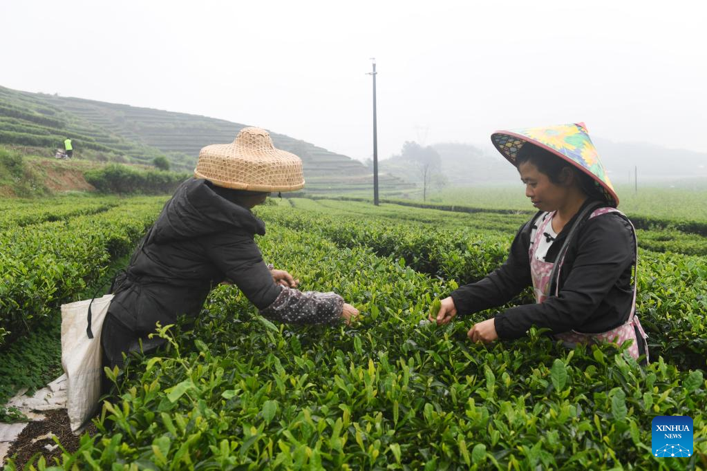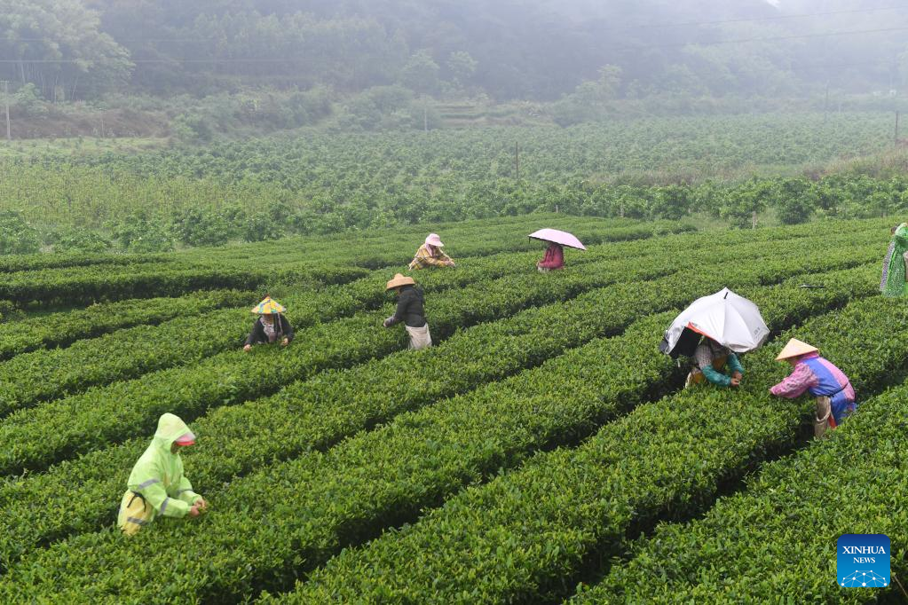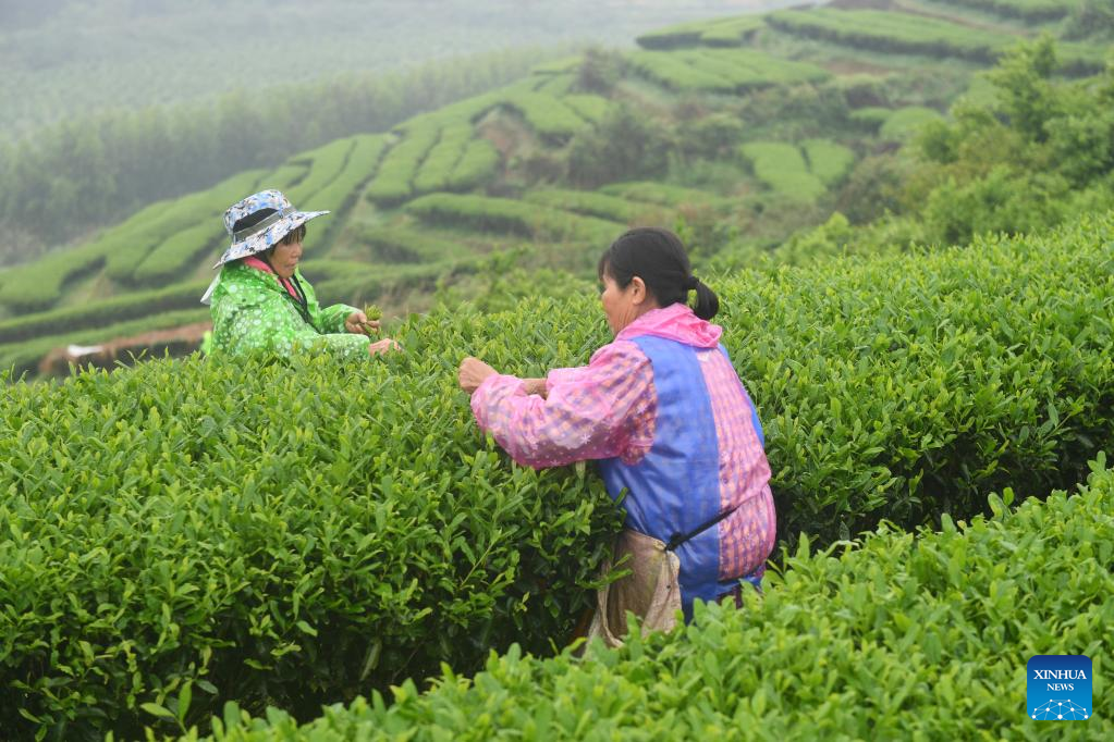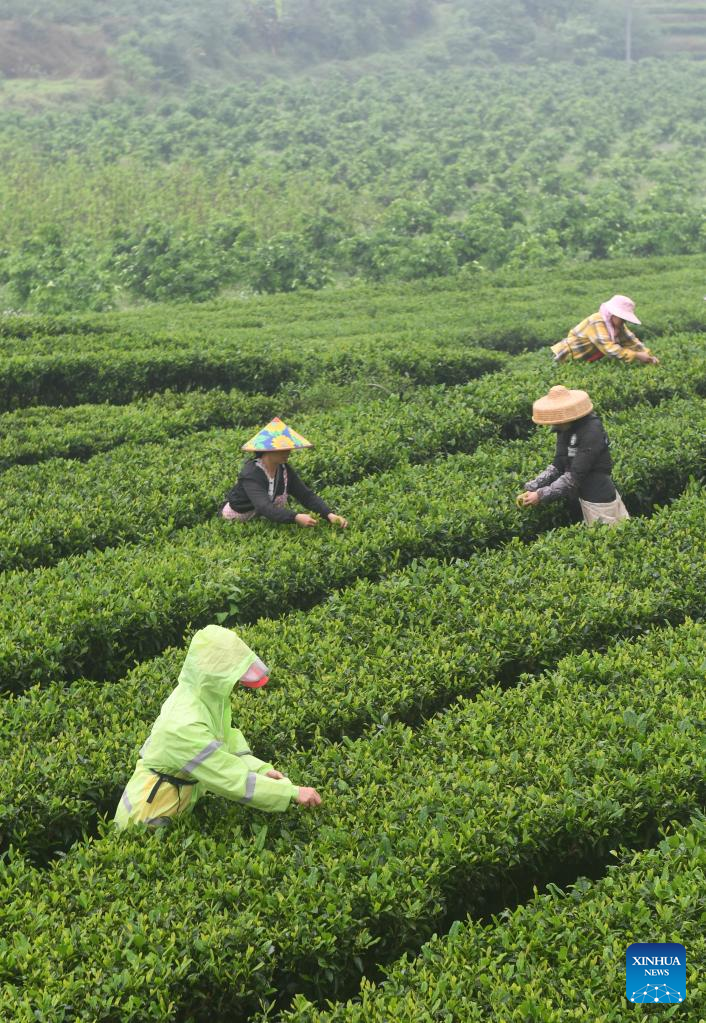 Farmers pick tea leaves at a tea garden in Shanglin County, south China's Guangxi Zhuang Autonomous Region, March 30, 2022. (Xinhua/Lu Boan)
