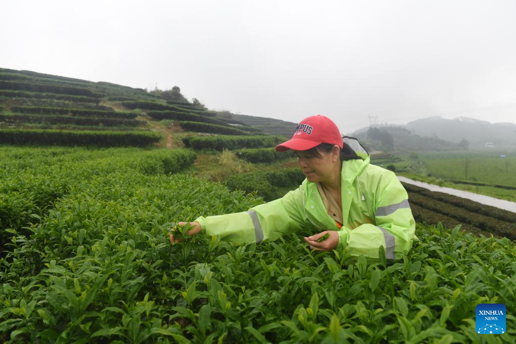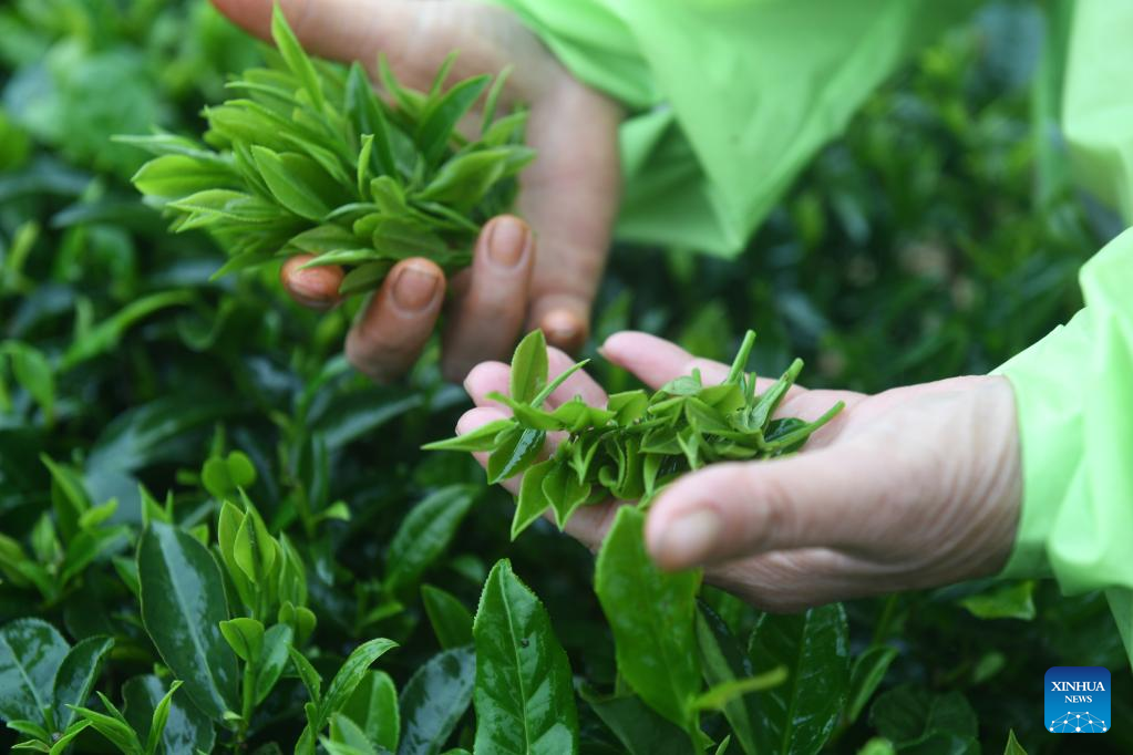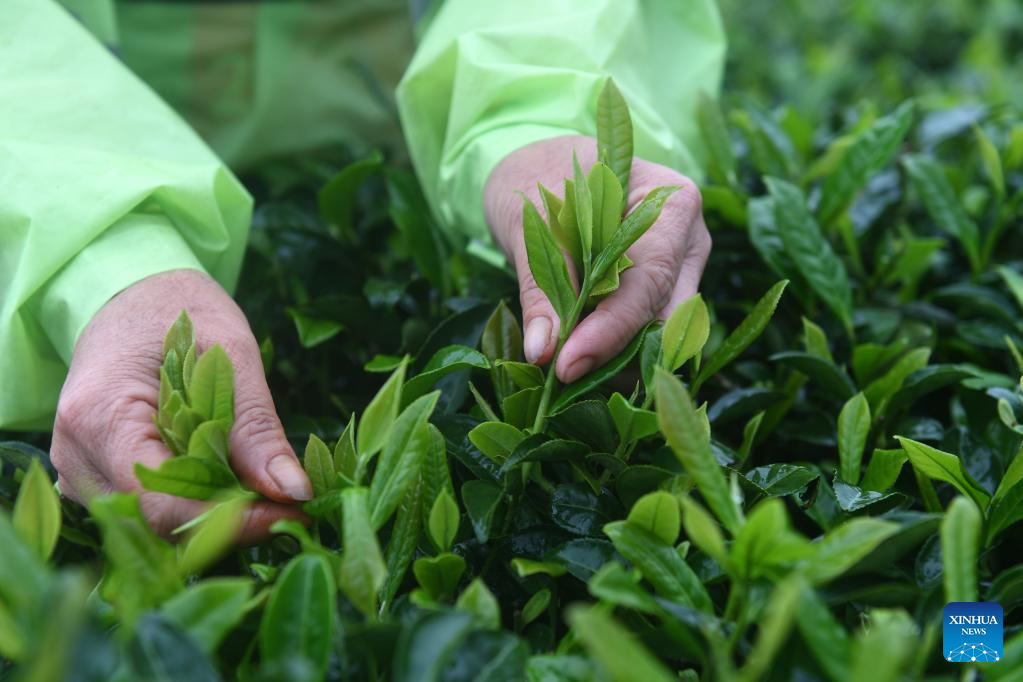 A farmer picks tea leaves at a tea garden in Shanglin County, south China's Guangxi Zhuang Autonomous Region, March 30, 2022. (Xinhua/Lu Boan)