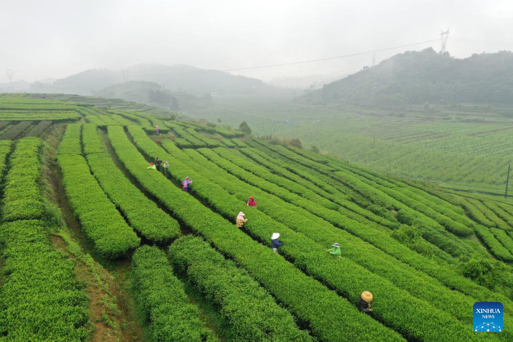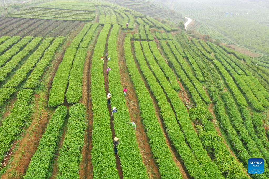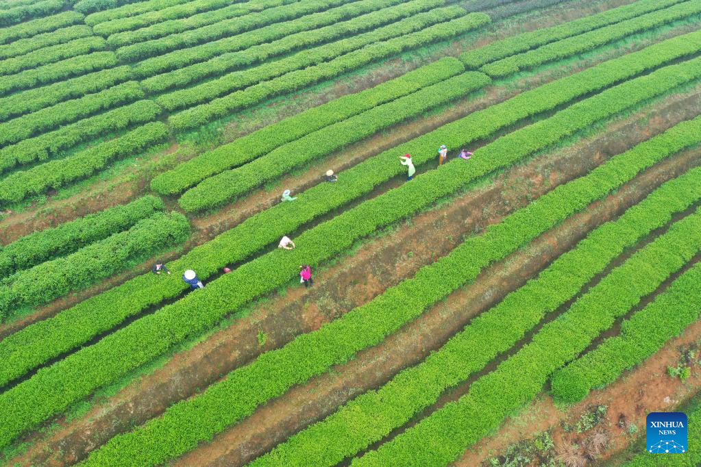 Aerial photo taken on March 30, 2022 shows farmers picking tea leaves at a tea garden in Shanglin County, south China's Guangxi Zhuang Autonomous Region. (Xinhua/Lu Boan)