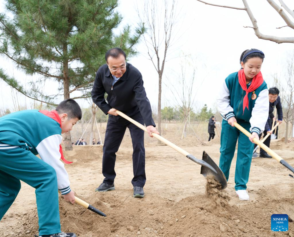 Li Keqiang plants a tree during a tree-planting activity in Daxing District in Beijing, capital of China, March 30, 2022. President Xi Jinping, also general secretary of the Communist Party of China Central Committee and chairman of the Central Military Commission, on Wednesday planted trees in Beijing, marking the 10th year of his participation as the top leader in the annual tree-planting activity in the Chinese capital. The activity was also attended by other leaders including Li Keqiang, Li Zhanshu, Wang Yang, Wang Huning, Zhao Leji, Han Zheng and Wang Qishan. (Xinhua/Ding Lin)
