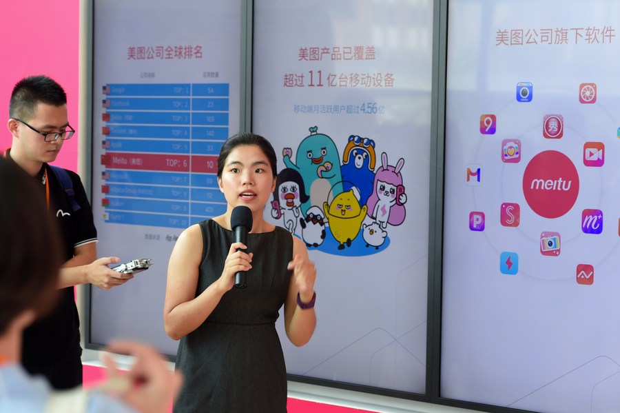 A staff member of Meitu introduces the company's development at Xiamen Software Park in Xiamen, southeast China's Fujian Province, Aug. 3, 2017.(Xinhua/Jiang Kehong)