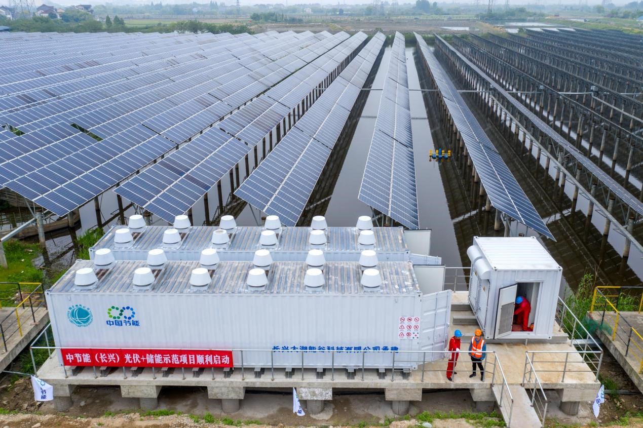 Photo taken on April 23, 2021 shows an aerial view of a project combining new energy power generation and energy storage at an industrial park in Lvshan township, Changxing county, Huzhou city, east China’s Zhejiang province. The industrial park operated by China Energy Conservation and Environmental Protection Group features the integration of photovoltaic power generation and fish farming. (People’s Daily Online/Tan Yunfeng)
