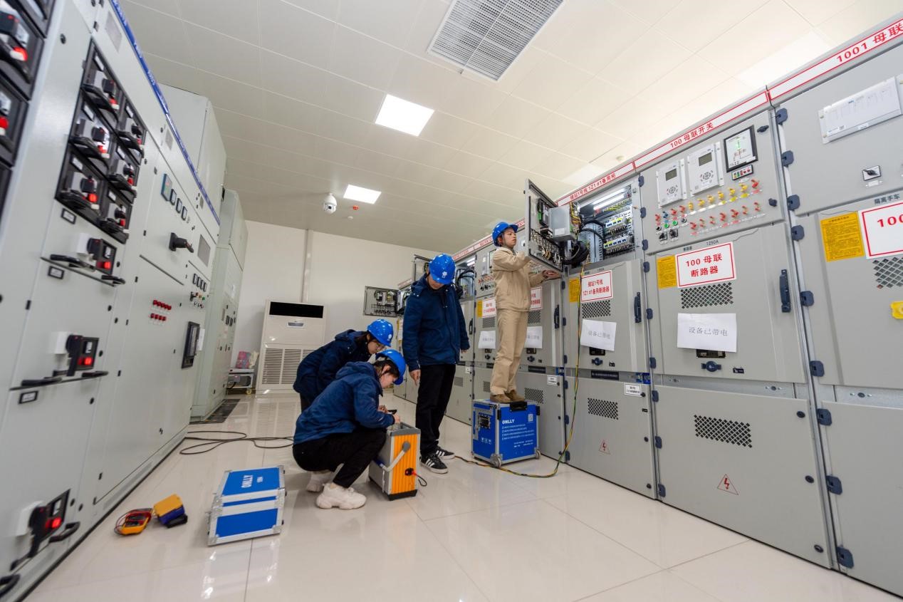 Technicians conduct an acceptance inspection of protective devices of electrical equipment at an electrochemical energy storage power station in Nanjing Jiangbei New Area, east China’s Jiangsu province, March 1, 2022. (People’s Daily Online/Du Yi)