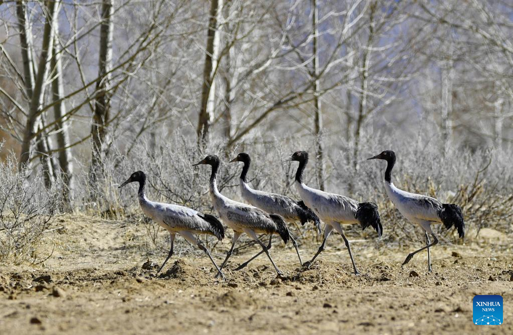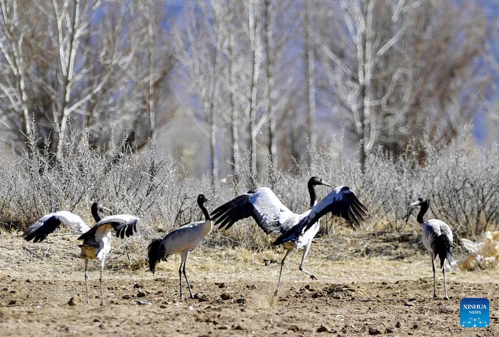 Black-necked cranes are pictured in Namling County of Xigaze City, southwest China's Tibet Autonomous Region, March 29, 2022.