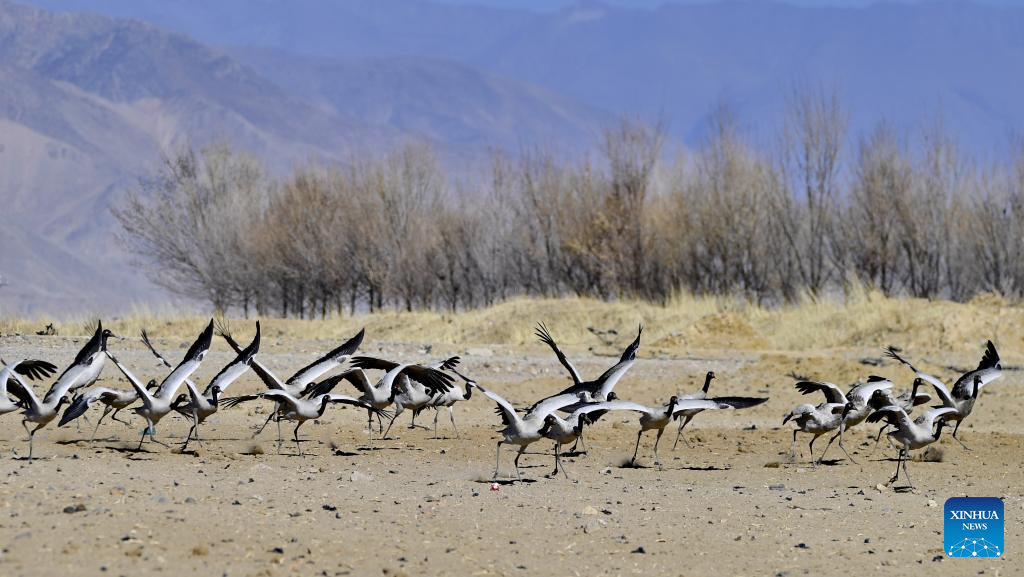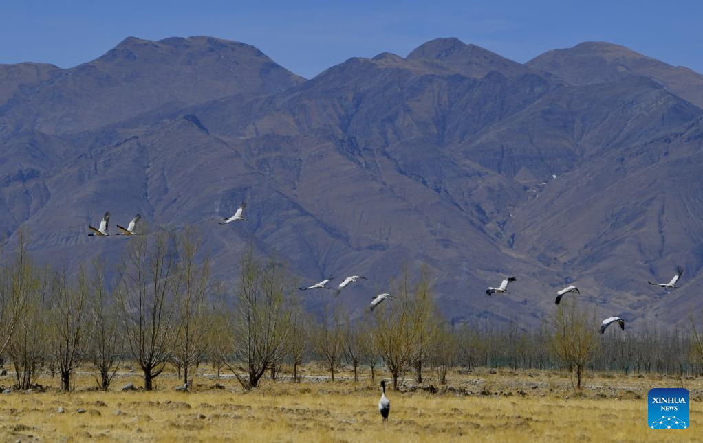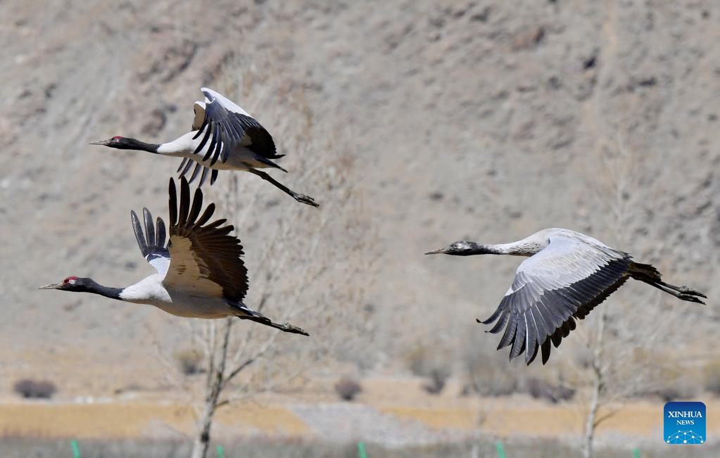 Black-necked cranes fly in Namling County of Xigaze City, southwest China's Tibet Autonomous Region, March 29, 2022.