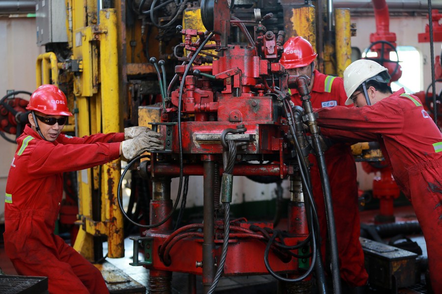 File photo shows workers of the China National Offshore Oil Corporation (CNOOC) drilling at the Bozhong 13-2 field, which is situated in the middle of the Bohai Sea, 140 km away from north China's Tianjin Municipality. (Tianjin branch of CNOOC/Handout via Xinhua)