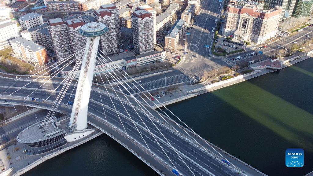 Aerial photo taken on March 28, 2022 shows the Jintang bridge over the Haihe River in north China's Tianjin. (Xinhua/Li Ran)