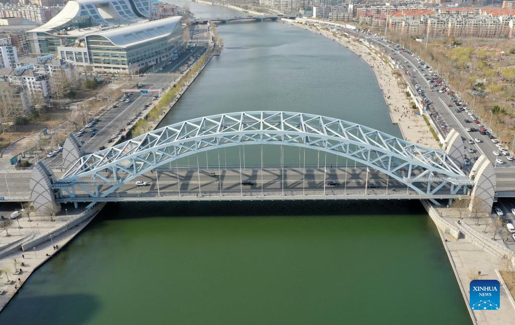 Aerial photo taken on March 28, 2022 shows the Yongle bridge over the Haihe River in north China's Tianjin. (Xinhua/Li Ran)