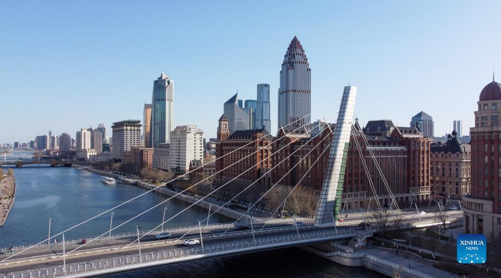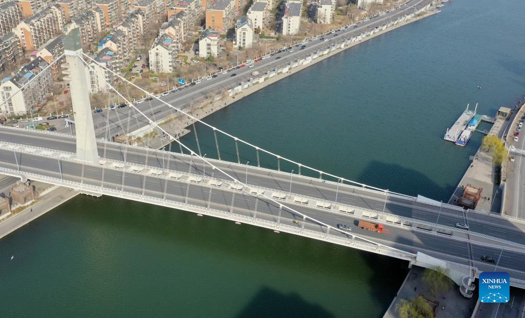 Aerial photo taken on March 27, 2022 shows the Baoding bridge over the Haihe River in north China's Tianjin. (Xinhua/Sun Fanyue)