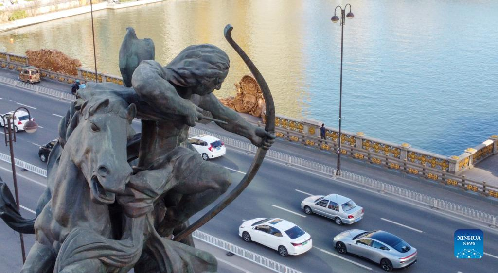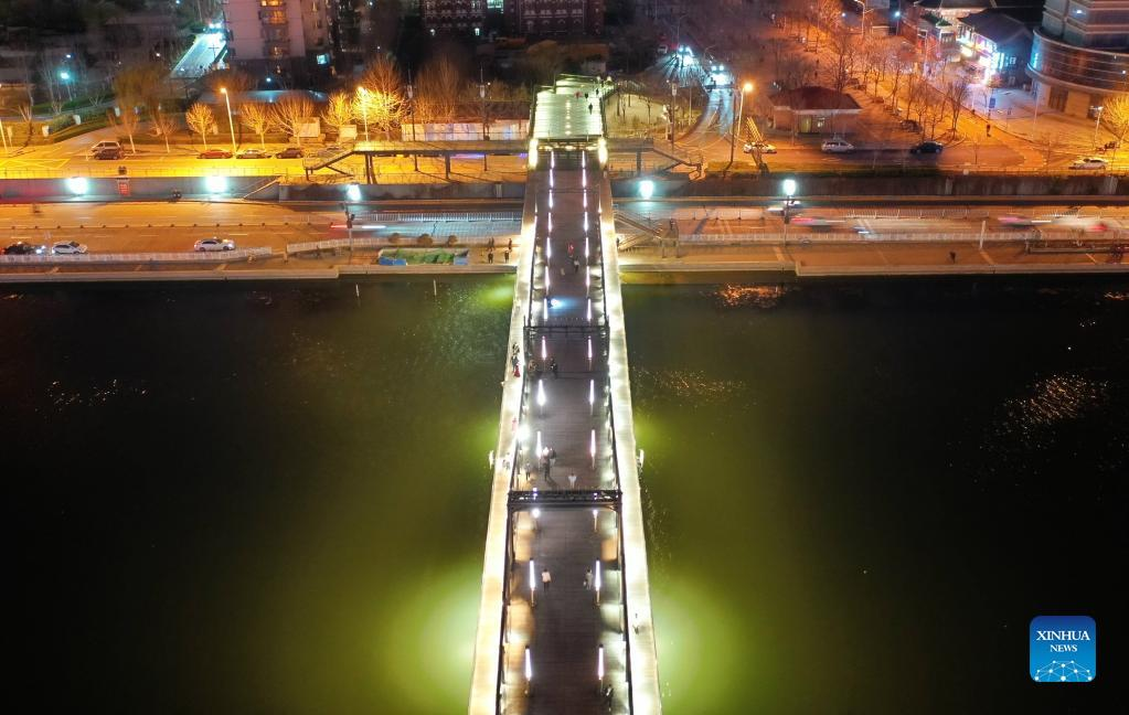 Aerial photo taken on March 27, 2022 shows the Chifeng bridge over the Haihe River in north China's Tianjin. (Xinhua/Sun Fanyue)