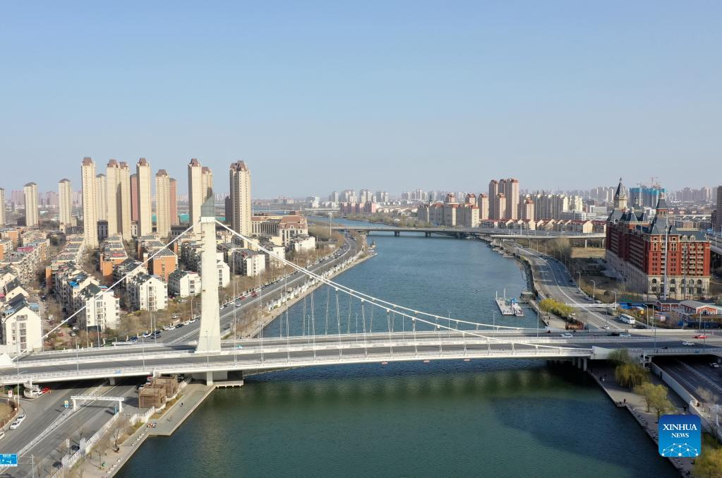 Aerial photo taken on March 26, 2022 shows the Bei'an bridge over the Haihe River in north China's Tianjin. (Xinhua/Li Ran)