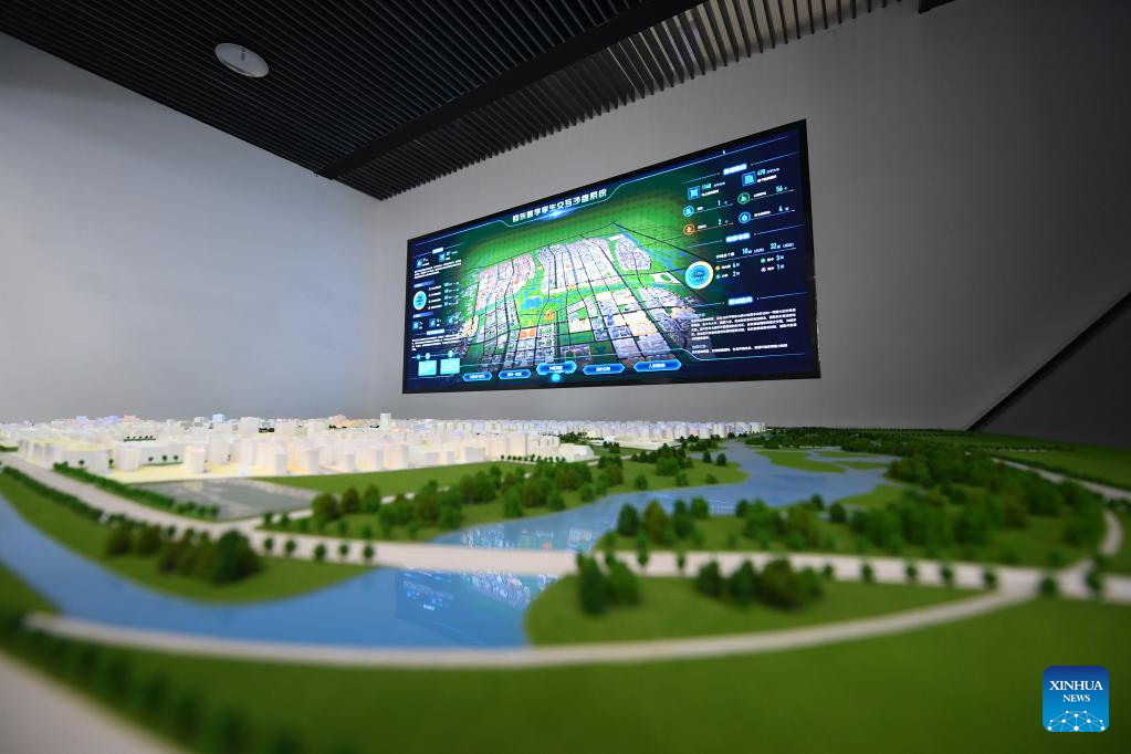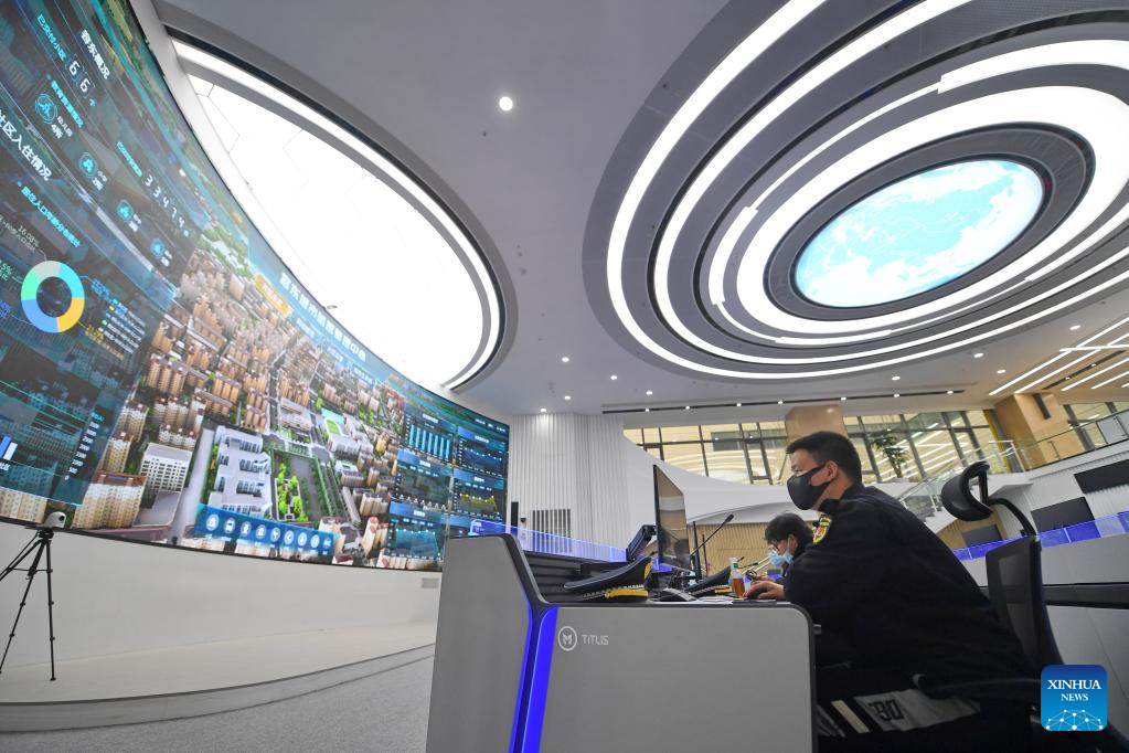 Photo taken on March 29, 2022 shows a view of the intelligent operations center in Rongdong District of Xiong'an New Area, north China's Hebei Province. Dubbed China's youngest city and a "city of the future," Xiong'an New Area marks its fifth anniversary on Friday. China announced plans to establish Xiong'an New Area on April 1, 2017, to relieve Beijing of functions non-essential to its role as the national capital and advance the coordinated development of the Beijing-Tianjin-Hebei region.By the end of 2021, construction has begun on 177 key projects in Xiong'an, with a total investment of 618.4 billion yuan (97.2 billion U.S. dollars). Sixty of them have been completed. So far, the major roads to the city, the main streets in the city, the Ecological Corridor, and the urban water system have taken shape.(Xinhua/Zhu Xudong)
