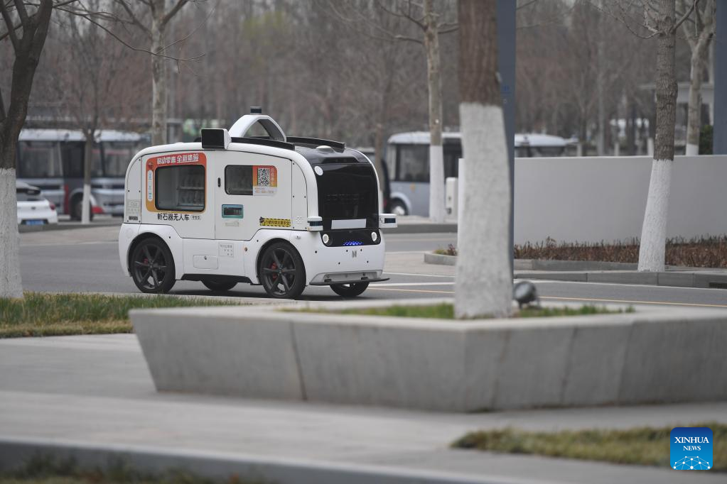 Photo taken on March 31, 2022 shows an intelligent vendor vehicle in Xiong'an New Area, north China's Hebei Province. Dubbed China's youngest city and a "city of the future," Xiong'an New Area marks its fifth anniversary on Friday. China announced plans to establish Xiong'an New Area on April 1, 2017, to relieve Beijing of functions non-essential to its role as the national capital and advance the coordinated development of the Beijing-Tianjin-Hebei region.By the end of 2021, construction has begun on 177 key projects in Xiong'an, with a total investment of 618.4 billion yuan (97.2 billion U.S. dollars). Sixty of them have been completed. So far, the major roads to the city, the main streets in the city, the Ecological Corridor, and the urban water system have taken shape.(Xinhua/Zhu Xudong)