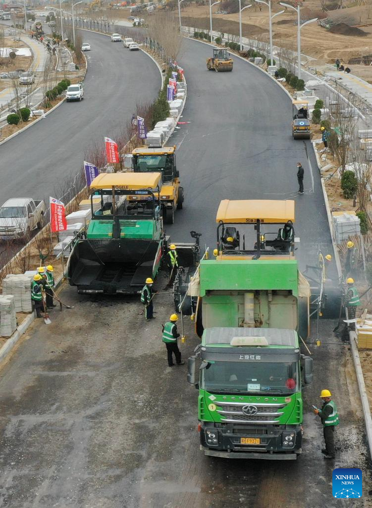 In this aerial photo, workers pave a road in Xiong'an New Area, north China's Hebei Province, March 25, 2022. Dubbed China's youngest city and a "city of the future," Xiong'an New Area marks its fifth anniversary on Friday. China announced plans to establish Xiong'an New Area on April 1, 2017, to relieve Beijing of functions non-essential to its role as the national capital and advance the coordinated development of the Beijing-Tianjin-Hebei region.By the end of 2021, construction has begun on 177 key projects in Xiong'an, with a total investment of 618.4 billion yuan (97.2 billion U.S. dollars). Sixty of them have been completed. So far, the major roads to the city, the main streets in the city, the Ecological Corridor, and the urban water system have taken shape.(Xinhua/Yang Shiyao)