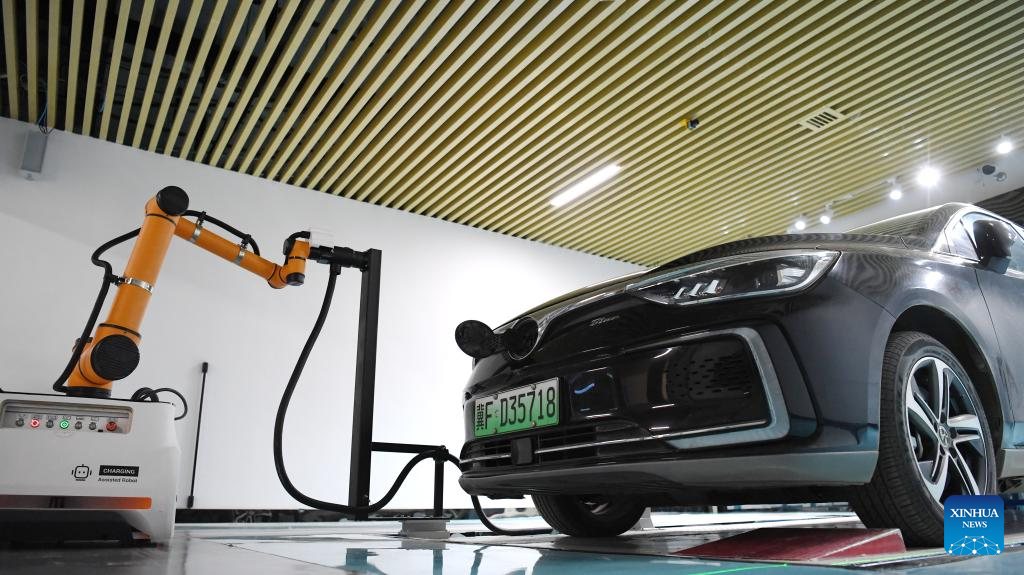 An electric vehicle gets charged up via a robot at a charging station in Xiong'an New Area, north China's Hebei Province, March 18, 2022. Dubbed China's youngest city and a "city of the future," Xiong'an New Area marks its fifth anniversary on Friday. China announced plans to establish Xiong'an New Area on April 1, 2017, to relieve Beijing of functions non-essential to its role as the national capital and advance the coordinated development of the Beijing-Tianjin-Hebei region.By the end of 2021, construction has begun on 177 key projects in Xiong'an, with a total investment of 618.4 billion yuan (97.2 billion U.S. dollars). Sixty of them have been completed. So far, the major roads to the city, the main streets in the city, the Ecological Corridor, and the urban water system have taken shape.(Xinhua/Zhu Xudong)
