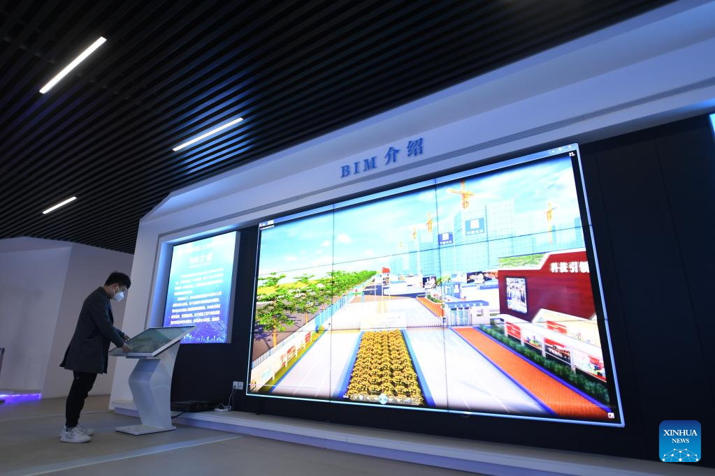An engineer expounds on the building information modeling (BIM) technology in Xiong'an New Area, north China's Hebei Province, March 29, 2022. Dubbed China's youngest city and a "city of the future," Xiong'an New Area marks its fifth anniversary on Friday. China announced plans to establish Xiong'an New Area on April 1, 2017, to relieve Beijing of functions non-essential to its role as the national capital and advance the coordinated development of the Beijing-Tianjin-Hebei region. By the end of 2021, construction has begun on 177 key projects in Xiong'an, with a total investment of 618.4 billion yuan (97.2 billion U.S. dollars). Sixty of them have been completed. So far, the major roads to the city, the main streets in the city, the Ecological Corridor, and the urban water system have taken shape. (Xinhua/Zhu Xudong)