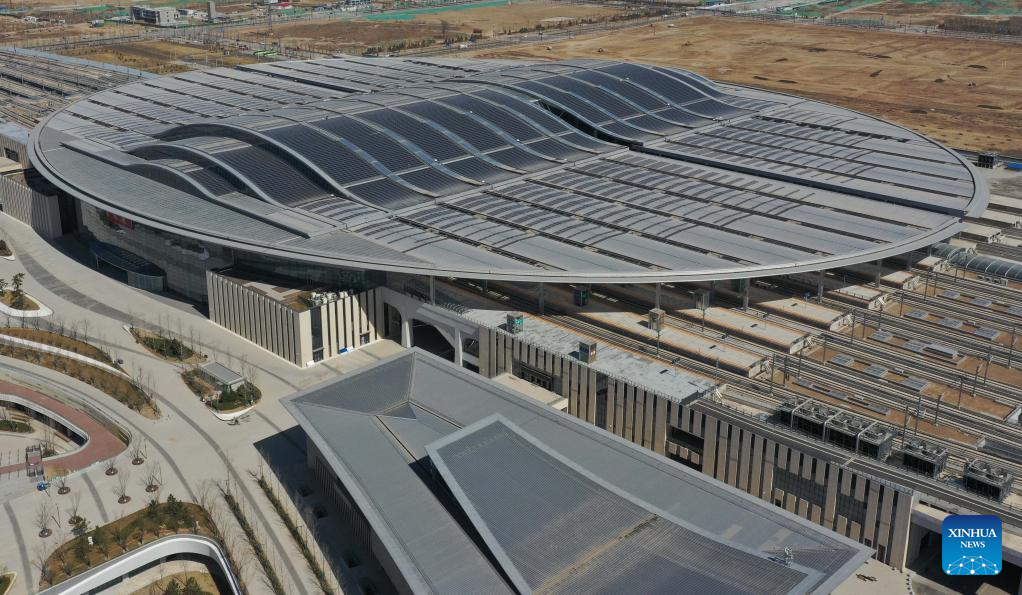 Aerial photo taken on March 31, 2022 shows the Xiong'an Railway Station in Xiong'an New Area, north China's Hebei Province. Dubbed China's youngest city and a "city of the future," Xiong'an New Area marks its fifth anniversary on Friday. China announced plans to establish Xiong'an New Area on April 1, 2017, to relieve Beijing of functions non-essential to its role as the national capital and advance the coordinated development of the Beijing-Tianjin-Hebei region.By the end of 2021, construction has begun on 177 key projects in Xiong'an, with a total investment of 618.4 billion yuan (97.2 billion U.S. dollars). Sixty of them have been completed. So far, the major roads to the city, the main streets in the city, the Ecological Corridor, and the urban water system have taken shape.(Xinhua/Yang Shiyao)