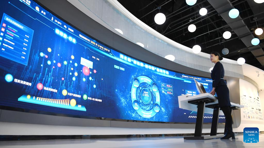 Photo taken on March 18, 2022 shows a carbon emission supervision platform in Xiong'an New Area, north China's Hebei Province. Dubbed China's youngest city and a "city of the future," Xiong'an New Area marks its fifth anniversary on Friday. China announced plans to establish Xiong'an New Area on April 1, 2017, to relieve Beijing of functions non-essential to its role as the national capital and advance the coordinated development of the Beijing-Tianjin-Hebei region.By the end of 2021, construction has begun on 177 key projects in Xiong'an, with a total investment of 618.4 billion yuan (97.2 billion U.S. dollars). Sixty of them have been completed. So far, the major roads to the city, the main streets in the city, the Ecological Corridor, and the urban water system have taken shape. (Xinhua/Zhu Xudong)