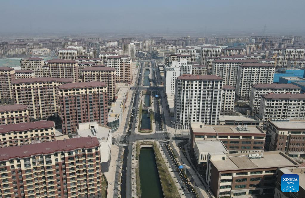Aerial photo taken on March 31, 2022 shows a view of Rongdong District in Xiong'an New Area, north China's Hebei Province. Dubbed China's youngest city and a "city of the future," Xiong'an New Area marks its fifth anniversary on Friday. China announced plans to establish Xiong'an New Area on April 1, 2017, to relieve Beijing of functions non-essential to its role as the national capital and advance the coordinated development of the Beijing-Tianjin-Hebei region.By the end of 2021, construction has begun on 177 key projects in Xiong'an, with a total investment of 618.4 billion yuan (97.2 billion U.S. dollars). Sixty of them have been completed. So far, the major roads to the city, the main streets in the city, the Ecological Corridor, and the urban water system have taken shape.(Xinhua/Yang Shiyao)