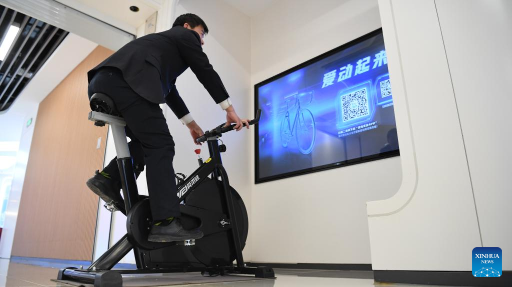 A man tries a fitness facility in Xiong'an New Area, north China's Hebei Province, March 18, 2022. Dubbed China's youngest city and a "city of the future," Xiong'an New Area marks its fifth anniversary on Friday. China announced plans to establish Xiong'an New Area on April 1, 2017, to relieve Beijing of functions non-essential to its role as the national capital and advance the coordinated development of the Beijing-Tianjin-Hebei region.By the end of 2021, construction has begun on 177 key projects in Xiong'an, with a total investment of 618.4 billion yuan (97.2 billion U.S. dollars). Sixty of them have been completed. So far, the major roads to the city, the main streets in the city, the Ecological Corridor, and the urban water system have taken shape.(Xinhua/Zhu Xudong)