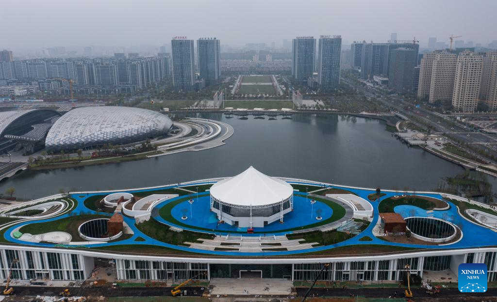 Areial photo taken on March 30, 2022, shows a view of Hangzhou Olympic Sports Centre Gymnasium and Hangzhou Olympic Sports Centre Aquatic Sports Arena, venues of the 19th Asian Games Hangzhou 2022 in Hangzhou, east China's Zhejiang Province. (Xinhua/Huang Zongzhi)