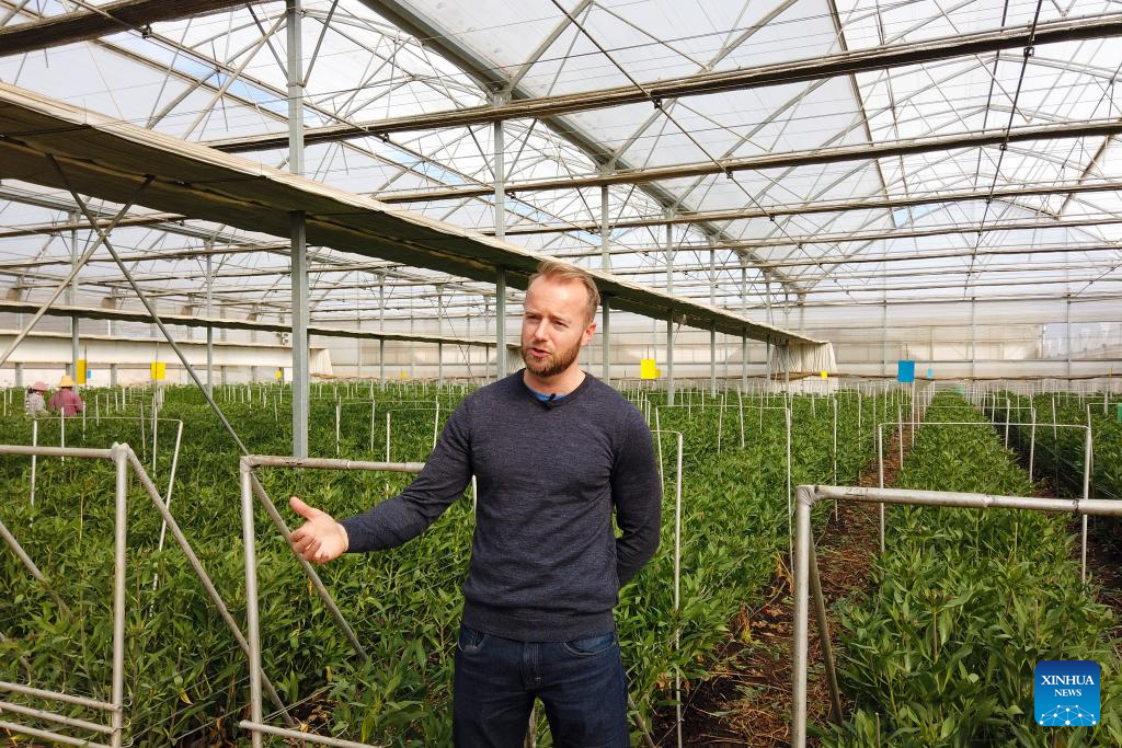 Tim Scalongne is interviewed at the greenhouse of the Kunming Hasfarm Flowers company in Kunming, southwest China's Yunnan Province, March 25, 2022.(Xinhua/Zhao Cailin)