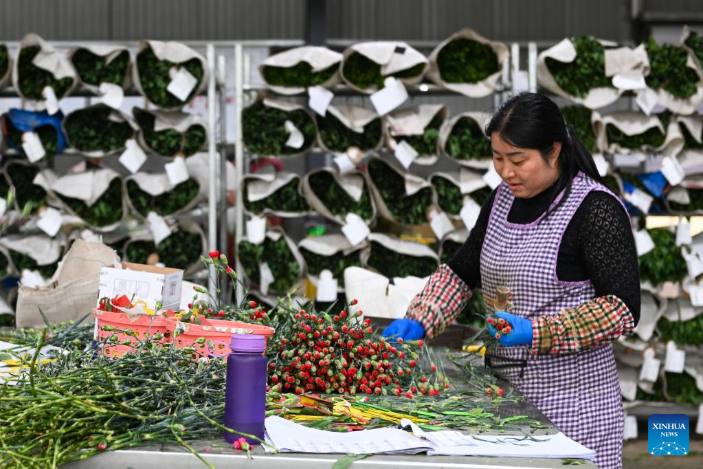 An employee works at a workshop of the Kunming Hasfarm Flowers company, in Kunming, southwest China's Yunnan Province, March 25, 2022.(Xinhua/Cao Mengyao)
