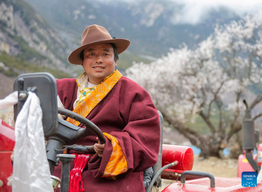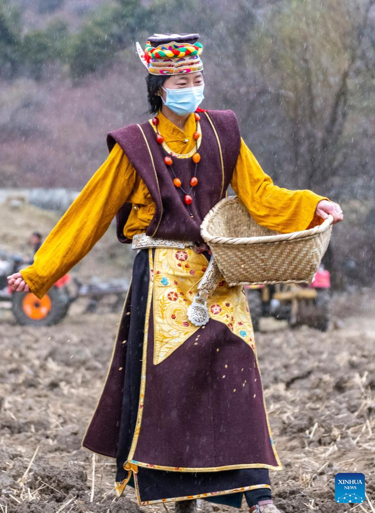 A villager attends a spring ploughing ceremony in Lhari County of Nagqu, southwest China's Tibet Autonomous Region, March 31, 2022. (Xinhua/Zhou Dixiao)