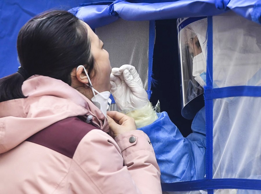 A medical worker takes a swab sample from a resident for nucleic acid test at a COVID-19 testing site in Changchun, northeast China's Jilin Province, March 24, 2022. (Photo by Wu Ran/Xinhua)