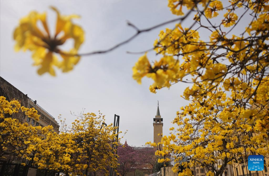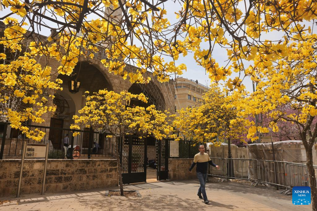 Blooming Tabebuia Chrysantha trees are seen in downtown Beirut, Lebanon, on March 31, 2022. (Xinhua/Liu Zongya)