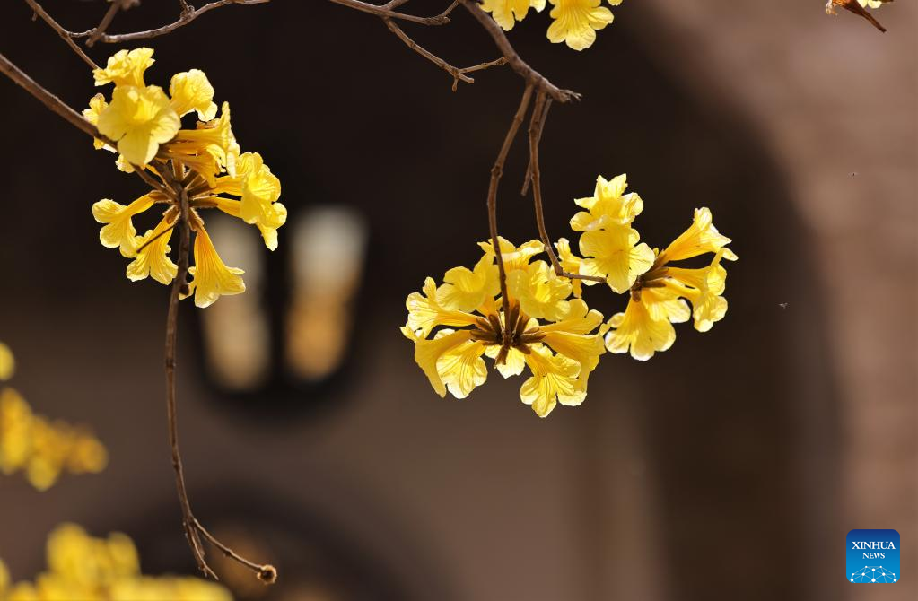 Tabebuia Chrysantha blossoms are seen in downtown Beirut, Lebanon, on March 31, 2022. (Xinhua/Liu Zongya)