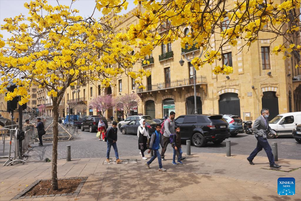 People walk past blooming Tabebuia Chrysantha trees in downtown Beirut, Lebanon, on March 31, 2022. (Xinhua/Liu Zongya)