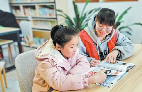 A student and a volunteer read in the reading room of Biji village, Fusui county, south China’s Guangxi Zhuang Autonomous Region on Feb. 16, 2022. (Photo/Zuojiang Daily)